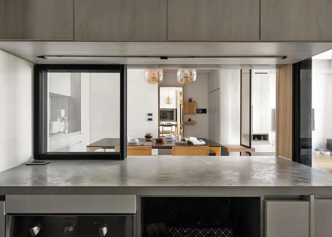 看這個(gè)屋主的中島開窗就用的很妙,嵌入通透鋁框窗不僅調(diào)和厚重壓迫感,也有利于夫妻倆分工合作傳送菜肴。
