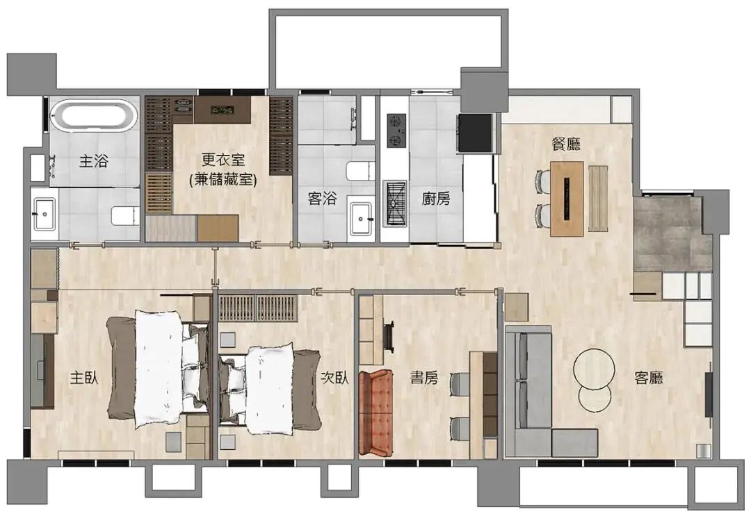 床和過道之間同樣用了夾紗淺隔斷來稍加遮掩。并且用木質(zhì)的床頭背景和床頭柜一體化設(shè)計(jì),減少搞衛(wèi)生的難度。對(duì)應(yīng)的主衛(wèi)比較可惜,沒有給到實(shí)景圖,只能看戶型圖看個(gè)布局了。