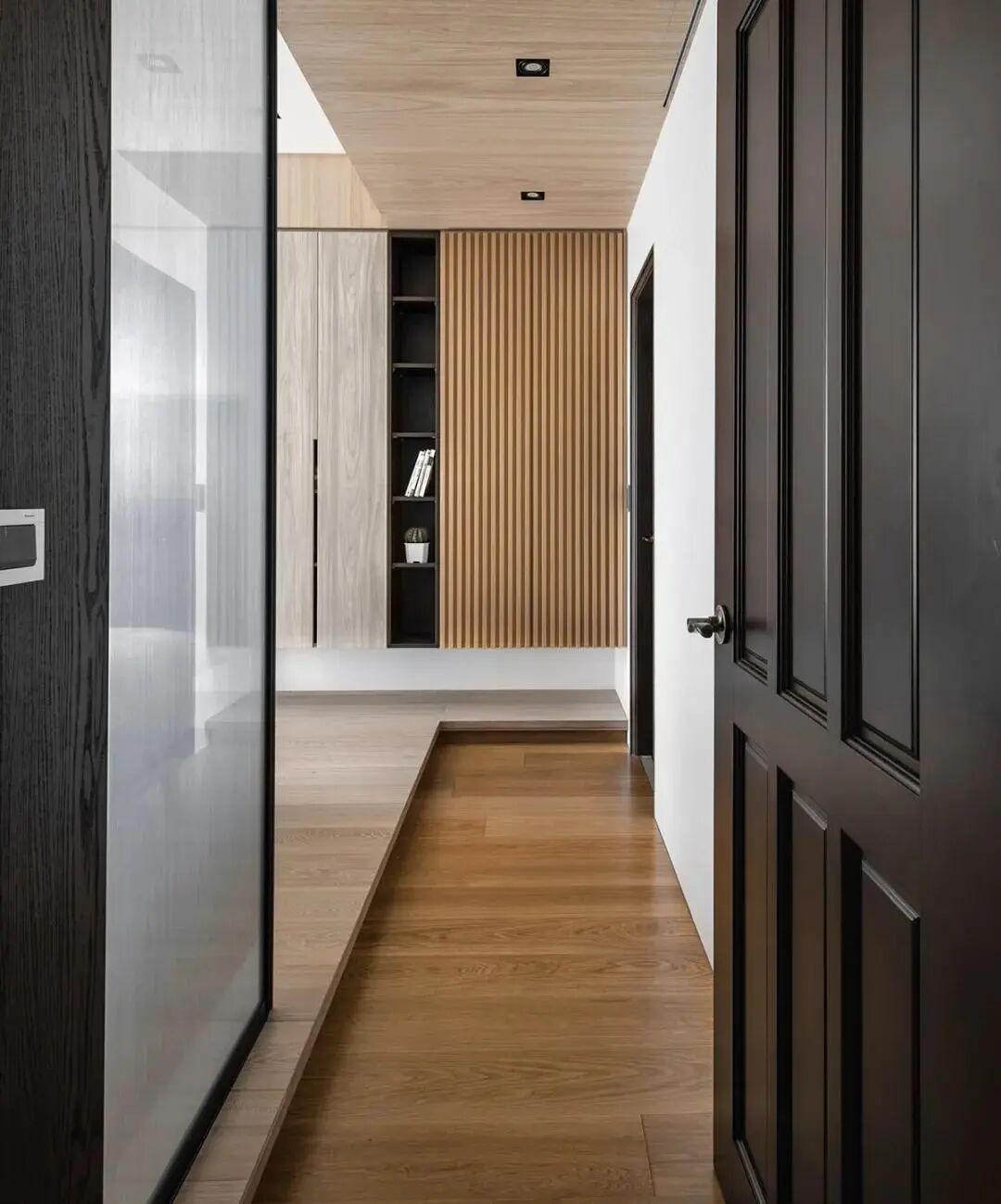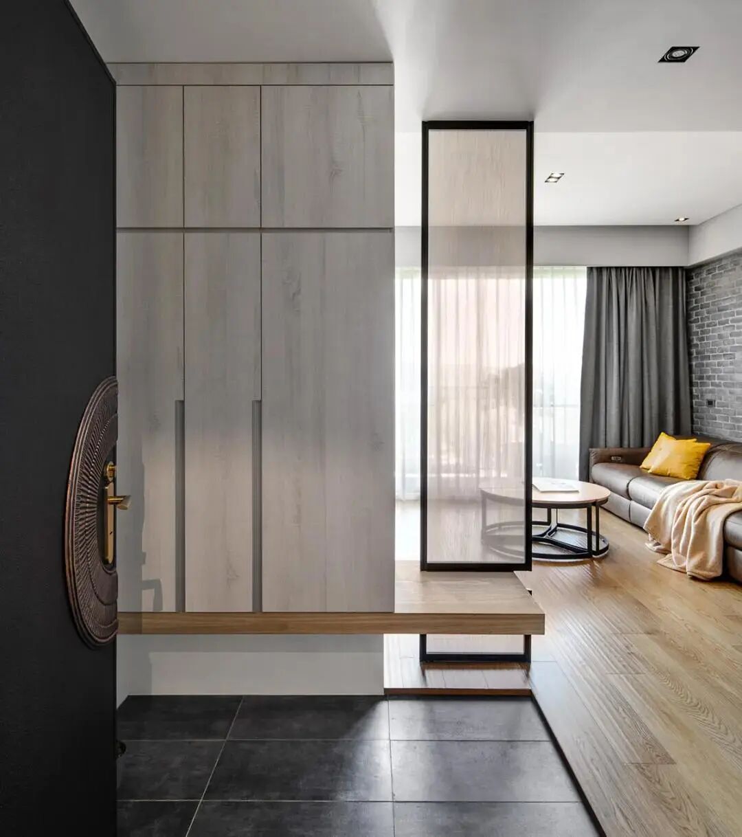 這個(gè)玄關(guān)的設(shè)置很值得原本沒有玄關(guān),并且入戶門正對(duì)陽臺(tái)的寶寶學(xué)習(xí)參考。因?yàn)檫@是一個(gè)靠柜體和黑框淺棕夾紗隔屏做成的玄關(guān)隔斷。進(jìn)門后靠墻位置主要用做穿衣鏡,小物置物擱板,以及變電箱修飾等實(shí)用細(xì)節(jié)。