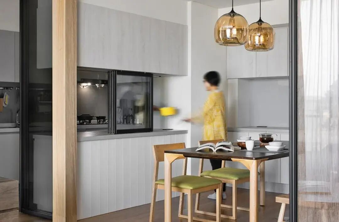 這就是喜歡中式爆炒的屋主,但又覺得中島對(duì)一個(gè)廚房來說還是超級(jí)實(shí)用的。所以在抉擇之間,和設(shè)計(jì)師一起討論出了這個(gè)方案——保留了中島,在廚房和餐廳之間開個(gè)窗,并在餐廳旁打造一排整體柜來放置小家電,作為西廚的配合。