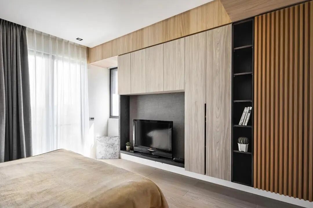 主臥空間是全屋最為溫馨的布置了。打開房門就看到日式木格柵打造的儲(chǔ)物柜,雖然它和整體柜連為一體,但是為了配合地面高低差帶來的視覺變化,特地在低的地板這邊用了同色格柵,也算用心良苦。
