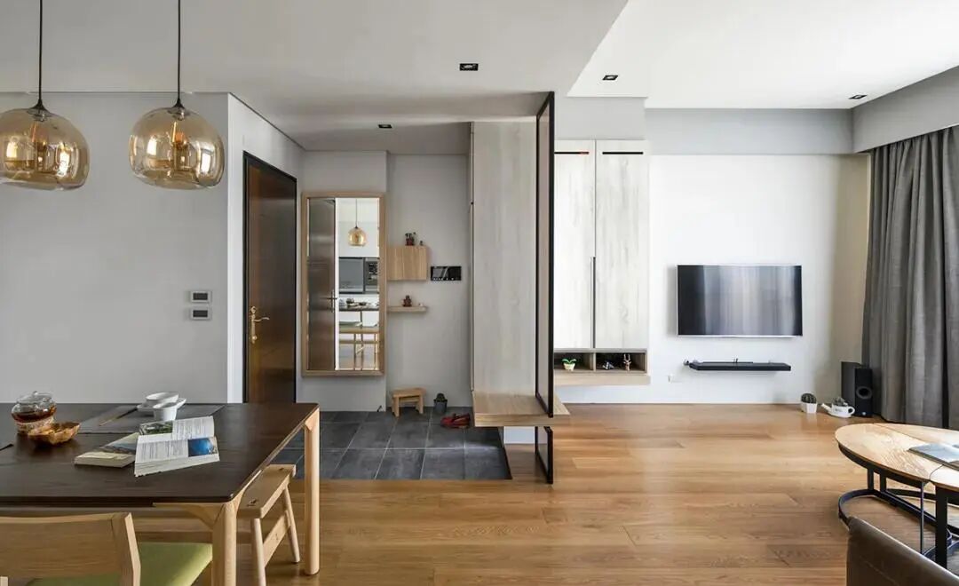 仔細(xì)看,你就會(huì)發(fā)現(xiàn),玄關(guān)柜的另一側(cè)一直延綿至客廳,一起組成了一個(gè)L型柜體。能為客廳也增加零散的收納區(qū),總是好的。剩下的電視背景墻就很簡(jiǎn)潔了,只一塊擱板+壁掛電視就搞定。