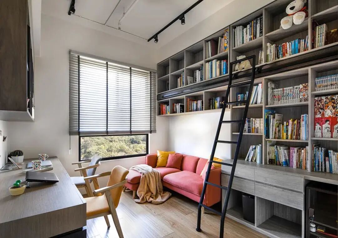 屋主家的藏書真的是足夠豐富了。因此書房必須好好利用起來。大面積淺色書柜,將書籍刊物、防潮箱一起陳列收納,并且考慮到高處拿取不方便,特地配備了一架可移動(dòng)式漆鋼制書柜梯,高處也搞定了,還頗有圖書館的味道。