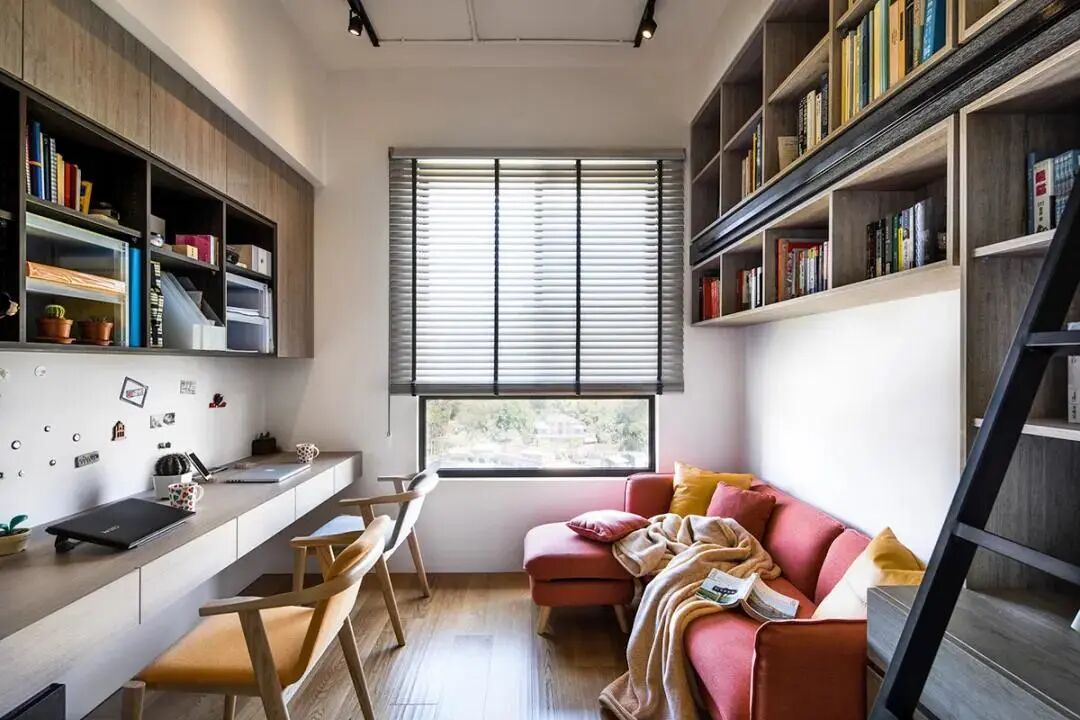 書架下一張可粉嫩嫩的沙發(fā)床,可供偶爾留宿的客人使用。對(duì)面的一面墻,主要以一字型的工作桌為主。為了不浪費(fèi)空間桌子上方也做起了半開放吊柜,陳列和收納并存。