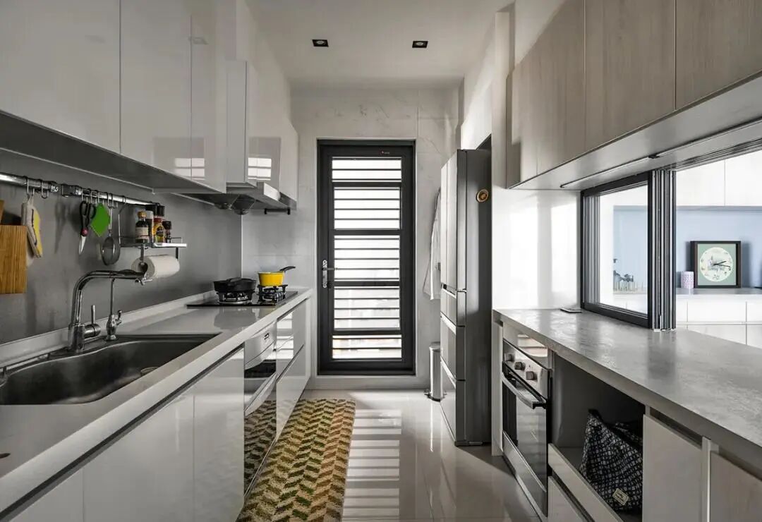 再來看看廚房?jī)?nèi)部,不管是廚房和陽臺(tái)之間,還是廚房和客廳之間都用的是玻璃門,這足以使明亮光線可以無礙穿透流動(dòng)。而主要的烹飪中心這邊選擇了相對(duì)比較容易清潔的瓷磚,搭配大面積純白滑面櫥柜烘托視覺份量。