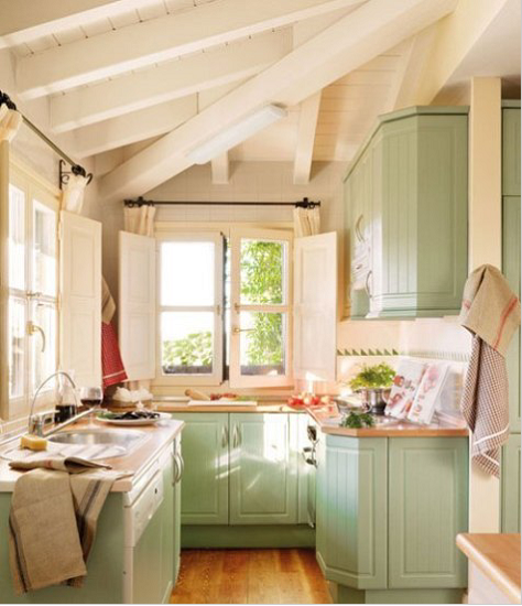 通透的玻璃窗為田園風(fēng)格小廚房裝修帶來明亮的視覺感受,親近自然的櫥柜營造親切的廚房環(huán)境,一盆漂亮的綠色植物妝點簡單的小廚房,在烹飪的同時有一股自然的清香味伴隨著你,清雅的田園風(fēng)格小廚房裝修帶給你無限的愜意享受。